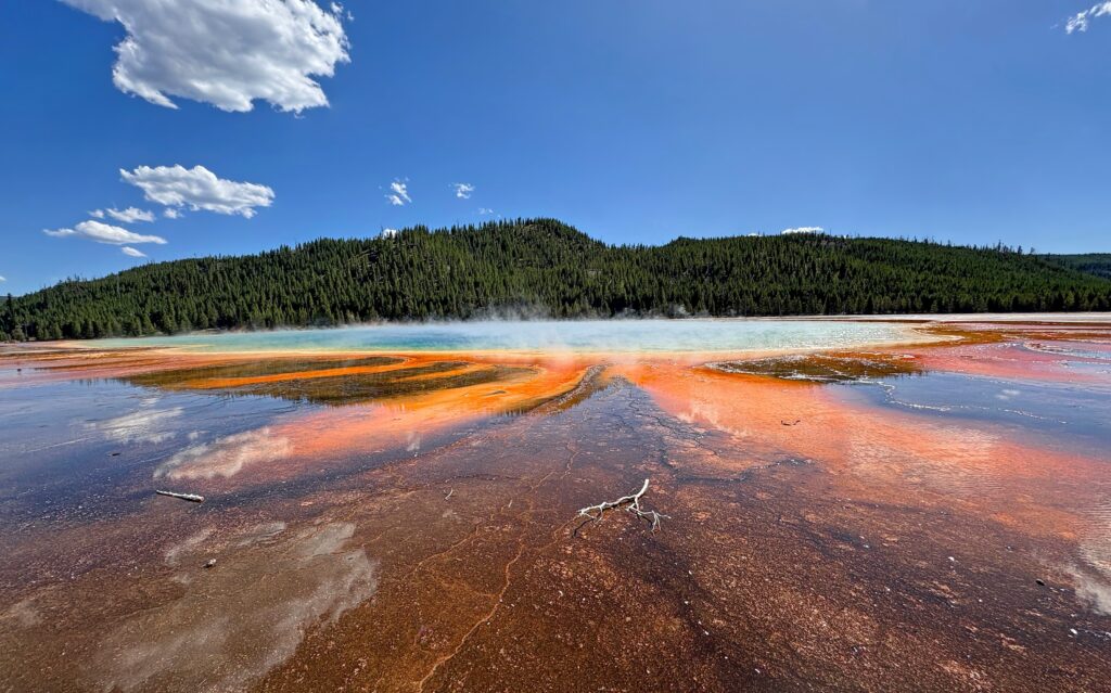 A Yellowstone egyik leglátványosabb helye a Grand Prismatic Spring, amely nemcsak a park legnagyobb hőforrása, hanem a világ egyik legismertebb természeti látványossága is. A forrás 60-100 méter átmérőjű, mélysége pedig meghaladja a 36 méter. A színei első pillantásra szinte valószerűtlennek tűnnek: a mélykéktől a zöldön, sárgán és narancson át egészen a vöröses árnyalatokig minden megjelenik benne.
